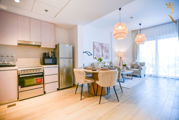 This comfortable 1-bedroom apartment in Waters Edge, Building 8 is thoughtfully designed for a cozy and convenient stay. The living area features a 3-seater sofa and a single armchair, complemented by a large LED TV—perfect for relaxing evenings. A dining table for four allows for shared meals, while the balcony offers two chairs and a table where you can unwind and enjoy the outdoor views. The fully equipped kitchen includes all the essential amenities you need to prepare meals during your stay.