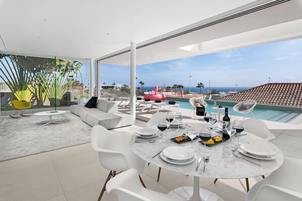 Die Karat Villa Murano liegt in Callao Salvaje an der Südwestküste Teneriffas und bietet auf 342 m² und 3 Etagen Platz für bis zu 8 Gäste mit atemberaubendem Blick auf den Atlantik und die Berge. Sie verfügt über 3 Schlafzimmer, 3 Bäder, ein zusätzliches WC sowie ein Wohnzimmer mit Schlafsofa für 2 Personen. Zur Ausstattung gehören eine private, voll ausgestattete Küche, Klimaanlage, Highspeed-WLAN für Videokonferenzen, TV, Waschmaschine, Trockner und ein Arbeitsplatz für das Homeoffice. Für Familien stehen Babybett, Hochstuhl und Babysitter-Service bereit.