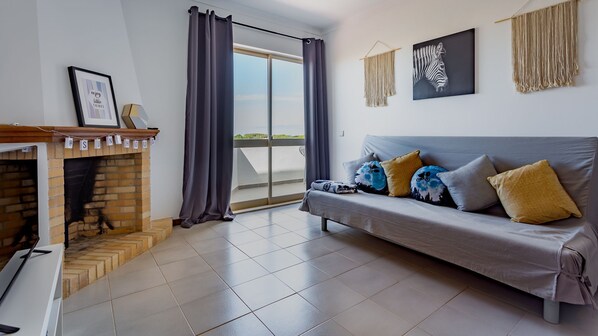 - A living room with a comfortable sofa-bed, cable TV, Wi-Fi, and a dining area.