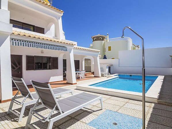Zona Galé 8 km von Albufeira: Gemütliche, freistehende, komfortable Villa "Casa Galé 600m from the beach", auf 2 Stockwerken, Baujahr 1992, renoviert im Jahre 2016. Im Ort da Galé, im Bezirk Albufeira, sonnige Lage im Villenviertel, 550 m vom Meer, in einer Sackgasse. Zur Alleinbenutzung: Grundstück 300 m2 (eingezäunt), Garten 20 m2, Schwimmbad eckig (8 x 4 m, 80 - 190 cm tief, saisonale Verfügbarkeit: 01.Jan. - 31.Dez.). Aussendusche, Gartenmöbel, Grill. Im Hause: Klimaanlage, Waschmaschine. Parkplatz beim Haus. Lebensmittelgeschäft, Supermarkt 400 m, Restaurant 300 m, Bar, Bäckerei, Biergarten, Bushaltestelle 400 m, Bahnstation "Estação de Tunes" 13.4 km, Sandstrand "São Lourenço" 550 m. Sporthafen 4.5 km, Jacht-Hafen 8.5 km, Golfplatz (18 Loch) 2.6 km, Surfschule 650 m, Minigolf 6.1 km, Reitstall 8.7 km. Nahe gelegene Sehenswürdigkeiten: Zoomarine 9.1 km, Algarve Shopping 7.8 km, Slide e Splash Parque Aquático 24.8 km, Marina de Albufeira 4.5 km, Castelo de Silves 22.2 km, Praia da Galé 1 km. Bitte beachten: geeignet für Familien. Jugendgruppen nur auf Anfrage. Be- und Entladen am Ferienhaus möglich.