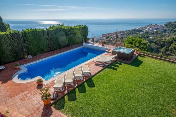 Diese neu renovierte Luxusvilla mit 7 Schlafzimmern in Almunecar ist der perfekte Rückzugsort für Ihren nächsten Urlaub. Die Villa wurde komplett renoviert und auf höchstem Niveau neu eingerichtet. Es gibt 5 Doppelzimmer, drei davon mit spektakulärem Blick auf das Mittelmeer, sowie ein Hauptschlafzimmer mit Bad und großer Terrasse, auf der Sie sich entspannen und die fantastische Aussicht genießen können. Der private beheizte Pool ist groß und beeindruckend, zusammen mit einem voll funktionsfähigen, ebenfalls beheizten Whirlpool! WIFI ist im gesamten Haus verfügbar.