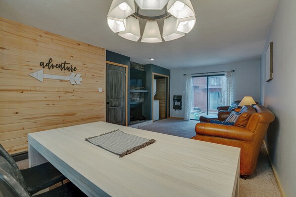 As you enter the condo, a half-bath is to your left, and to your right is the kitchen with full-size appliances, including a dishwasher. In the open living room, the dining area seats four. The living area seats four comfortably in front of a flat-screen smart TV, and there is access to the back deck. There is also a stacked washer/dryer.
