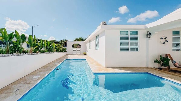 Outside, the highlight of this vacation home awaits - a private pool and comfortable outdoor furniture for the enjoyment of the group. Imagine spending leisurely afternoons soaking up the sun or cooling off with a refreshing swim. For those who prefer shade, a covered terrace with seating offers a perfect spot for family/friend quality time or evening cocktails under the stars. The outdoor space also features the home's second full bathroom and an extra outdoor shower to wash away the salt before dipping into pool time.