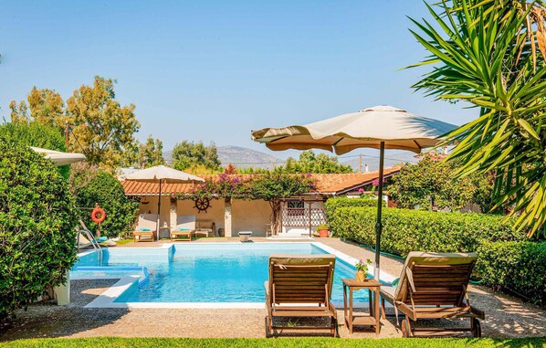 Das Haus verfügt über einen großen Pool mit weitläufigen Terrassen, ideal zum Sonnenbaden, mit bequemen Sonnenliegen und Tischen, um Ihr Frühstück zu genießen. Das Innere des Hauses bietet viel natürliches Licht und wirkt durch Holzdecken besonders gemütlich.