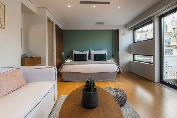 Our Acropolis Suite II apartment is designed in the luxurious, modern, and minimalistic Urban Stripes signature style. It features a queen-size bed, a bathroom with a walk-in shower and a seating area with a 43" TV for a gratifying stay. Step out onto the balcony to witness wonderful views of Athens Acropolis for an enchanting experience. With astounding yet simple architecture and all the necessary comforts, this lovely apartment is bound to excite guests.