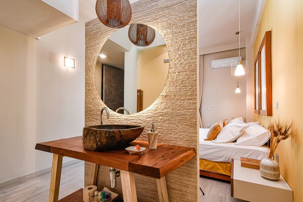 It can comfortably accommodate up to 6 persons in 2 bedrooms and an open space living room. The master ensuite bedroom offers a double bed. Second bedroom is equipped with a king size bed (that can also be separated to become a twin), and access to the balcony. Two more persons can be accommodated in the comfy living room sofas that turn into extra beds. All rooms are air-conditioned, bathed in plenty of light and offer TVs.