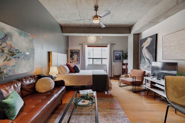 This chic, modern studio apartment boasts a complete kitchen, a full bathroom, and a queen-sized bed (60 inches wide by 80 inches long) for a restful stay. It features bar seating for two, ideal for dining and casual bites. The apartment's contemporary and eclectic decor creates an inviting and enjoyable ambiance.