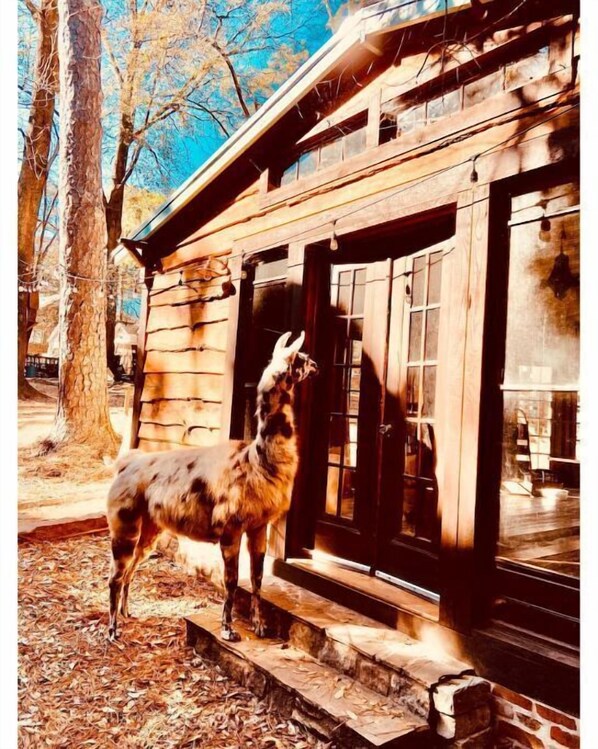 Our mid-century cottage is spacious and restored with loads architectural antiques and antique furniture. Think Chip & Joanna with luxurious bedding, amazing memory foam mattresses, and comfy spaces for lounging and watching our herd of llamas and alpacas roaming back behind the home. We are a working farm, so you’ll hear roosters and see the llamas and alpacas at the gate. Please don’t go beyond the gates as that space is reserved for treehouse guests
