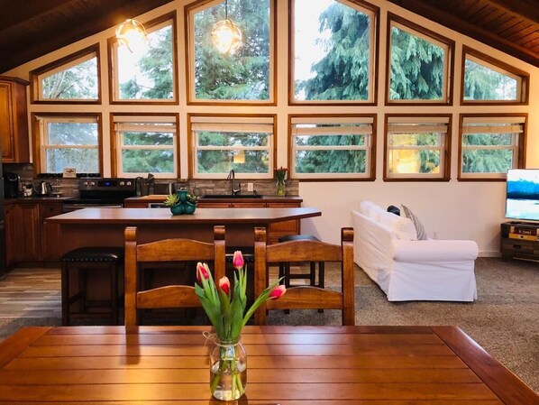 An open-concept kitchen, breakfast bar, large dining area, and cozy lounge with big-screen TV
