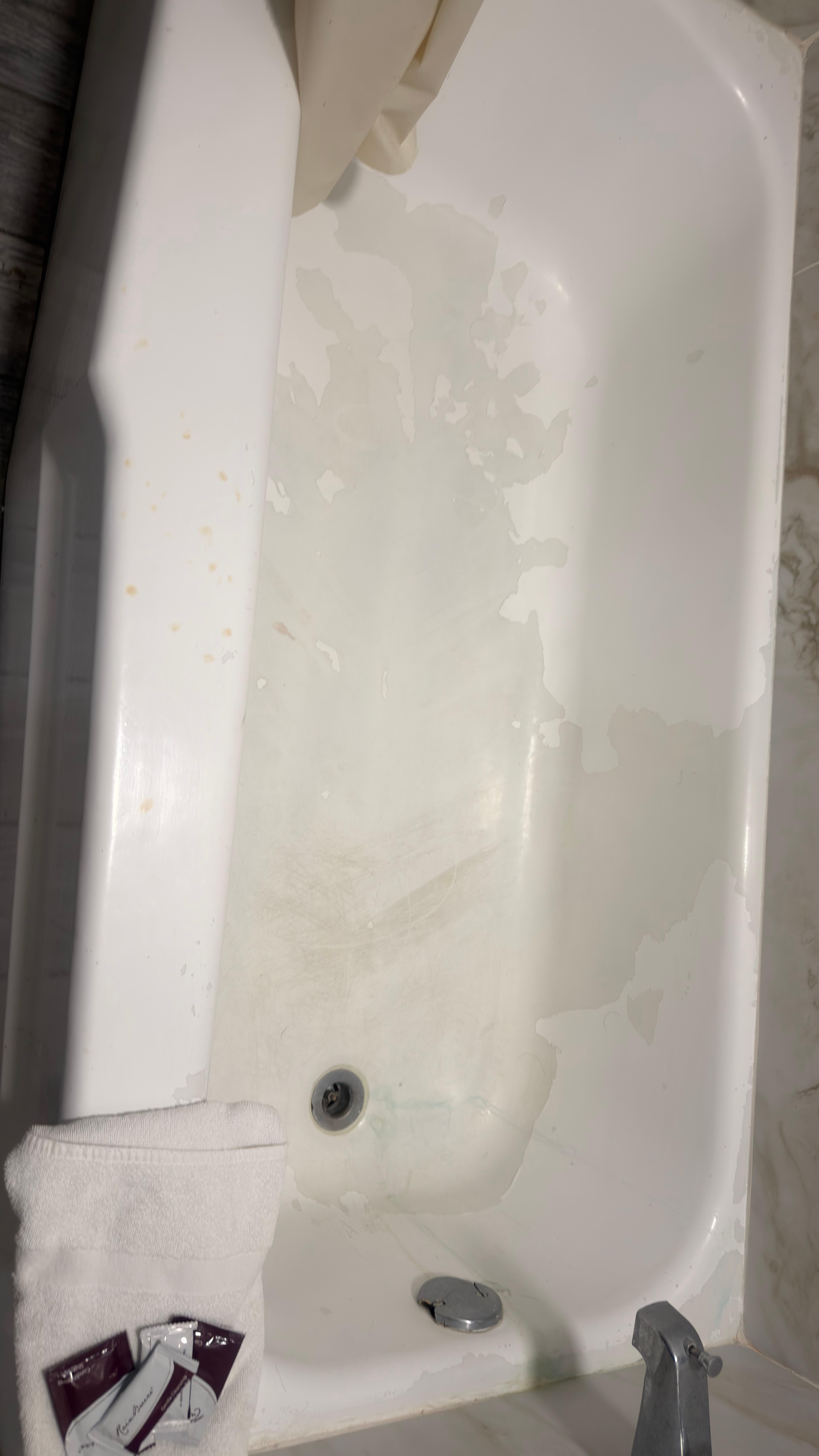 This motel has definitely seen better days. My floor a five inch diameter cave in hole in the floor. The bathtub looked like it was halfway through a paint restoration process, except the new paint was the old paint, and what was left the other half that had been completely chipped off.