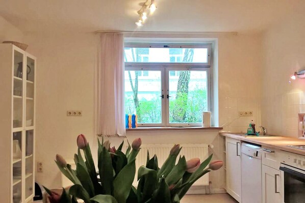 Die Fußbodenheizung sorgt für ein ausgeglichenes Raumklima in der gesamten 110 m² großen Wohnung. Die Zimmer sind alle sehr geräumig und gerade das große Wohnzimmer mit gemütlicher Couch eignet sich für entspannte Lümmelrunden. Das Badezimmer ist unspektakulär aber es erfüllt seinen Zweck. Im Garten stehen Obstbäume, an denen sich im Herbst gerne bedient werden kann.
