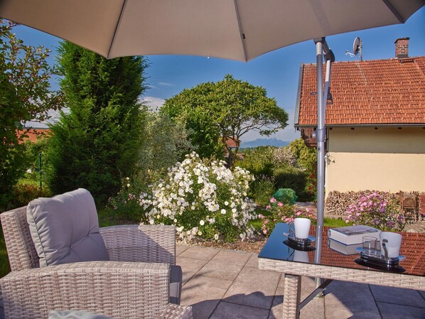 Großzügige Ferienwohnungs-Suite im OG des Haupthauses mit grandiosem Bergblick. Zwei Balkone, komfortables Schlafzimmer, luxuriöses Bad mit Badewanne und Dusche, separates WC mit Bidet und Urinal, Wohnküche, Abstellraum. Moderne Unterhaltungs-, Kommunikations- und Küchentechnik. Verstellbare Lattenroste, Bandscheiben-Matratzen. Umfangreiche Serviceleistungen. Frühstück auf Anfrage möglich.