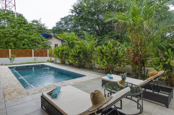 Entspannen Sie im Freien an Ihrem privaten Aquamarinpool in der Sonne oder im Schatten Ihrer Wahl. Es gibt viele Sitzgelegenheiten unter dem überdachten Überhang und Liegestühle am Pool für die Sonnenanbeter. Die Außendusche ist von viel Grün umgeben, wenn Sie direkt vom Strand kommen (oder einfach nur von Natur umgeben sein möchten!).