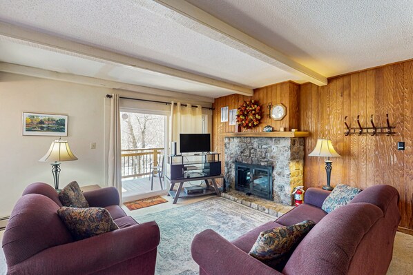 Perfekt gelegene Wohnung in den Bergen mit Blick auf den Balkon und einem Steinkamin