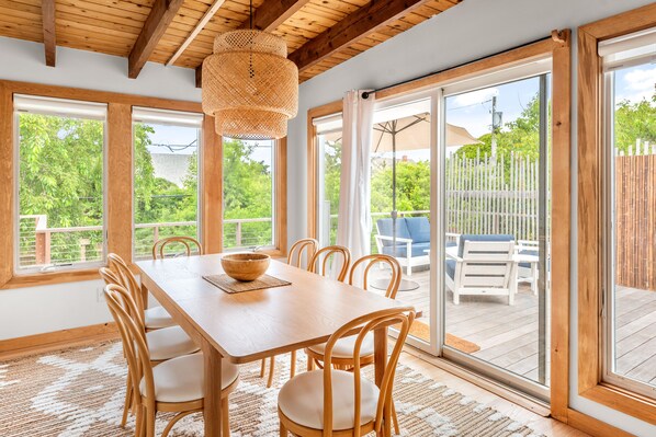 Dieses Haus bietet ein klassisches Fire Island-Erlebnis mit der Möglichkeit, dem Lärm und der Hektik des Alltags zu entfliehen. Das Haus ist ein entspannendes und ruhiges Refugium, das nur vier Häuser vom schönen Sandstrand entfernt ist. Kommen Sie von einem Tag in der Gegend zurück und genießen Sie ein gemütliches hausgemachtes Essen in der voll ausgestatteten Küche. Entspannen Sie bei einem Film oder einem Brettspiel. Wachen Sie morgens mit einem Kaffee auf dem Deck auf und fahren Sie mit dem verfügbaren Fahrrad zum Strand oder zum örtlichen Treffpunkt.