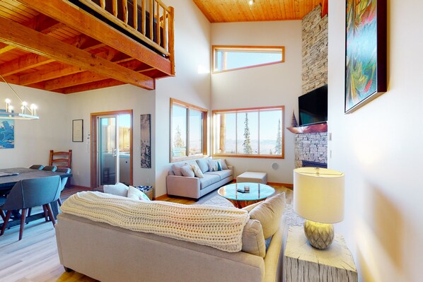 This two-story condo boasts vaulted ceilings, a warming gas fireplace, two living areas with TVs, and plenty of large windows that offer spectacular views of the Monashee Mountains. There is also a 70-inch TV in the lofted living space, plus a gaming system. The well-equipped, full kitchen includes stainless steel appliances that include a dishwasher, and plenty of space to help make meal prep and clean up easy. Afterward, step out onto the deck and take in the view from the comfort of your private hot tub.