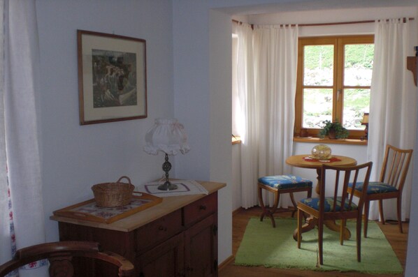 Helle, freundliche Nichtraucherzimmer: Wohnzimmer mit Balkon, Schlafzimmer mit Balkon, Wohnküche mit Loggia, Bad mit Wanne, Toilette, gesamt ca. 70qm. Das Schlafzimmer (ostseitig) ist mit Doppelbett (Matratze aus Naturlatexschaumstoff) im rustikalen Stil ausgestattet, das Wohnzimmer (ost- bzw. südseitig) ist eingerichtet mit Couchgarnitur, Kabel- TV/Radio. Hier befindet sich auch ein gemütlicher Kaminofen. In der Wohnküche mit rustikaler Eckbankgarnitur befindet sich eine Einbauzelle mit Kühlschrank und Gefrierfach, Mikrowelle, Kaffeemaschine, Wasserkocher, Eierkocher und ein 4-Platten-Elektroherd mit Backrohr. Im Wohnzimmer und in der Wohnküche ist ein Parkettfußboden, in den anderen Wohnräumen Teppichboden verlegt. Alle Zimmer sind über die zentrale, moderne Erdgasheizanlage thermostatgesteuert beheizbar. Kostenloses WLane vorhanden.