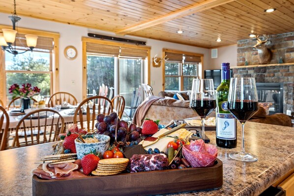 Our living area is a cozy spot where you can relax and enjoy beautiful views of nature right outside. The large windows bring the outdoors in, so you can appreciate the peaceful scenery as you unwind. While the fireplace adds a nice touch to the room, please note that it’s not functional. Whether you’re reading, chatting with family, or simply enjoying the view, this space offers comfort and a connection to the natural surroundings.