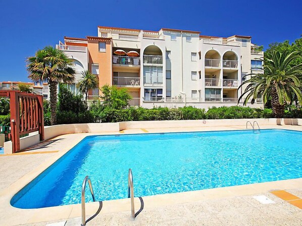 Residenz "Le Lagon Bleu". Im Ortsteil Richelieu, 300 m vom Meer, 300 m vom Strand. Zur Mitbenutzung: Schwimmbad (11 x 5 m, 100 - 200 cm tief, saisonale Verfügbarkeit: 07.Mai. - 30.Sep.). In der Anlage: Fahrstuhl. Einkaufszentrum 500 m, Restaurant 300 m, Bäckerei 120 m, Bushaltestelle "Corsaires" 280 m, Sandstrand "Rochelongue" 260 m, Freibad 3 km. Sporthafen 3.3 km, Golfplatz (27 Loch) 500 m, Tennis 3.2 km, Reitstall 2.3 km. Nahe gelegene Sehenswürdigkeiten: Aqualand 300 m, Ile des Loisirs 800 m, Casino 2.1 km, Musée de l'Ephèbe 3.4 km.