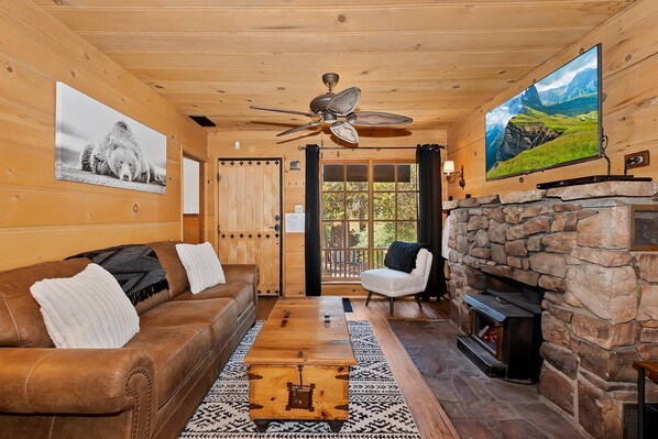 ✓Living Room: Sleeper sofa, original wood stove, large Samsung flat screen TV, warm natural decor