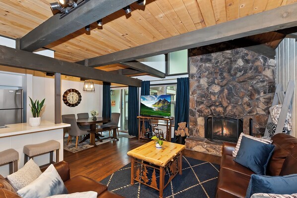 · Living Area: Wood paneled vaulted ceilings, wood burning rock fireplace, leather seating, and flat screen smart TV with sound bar