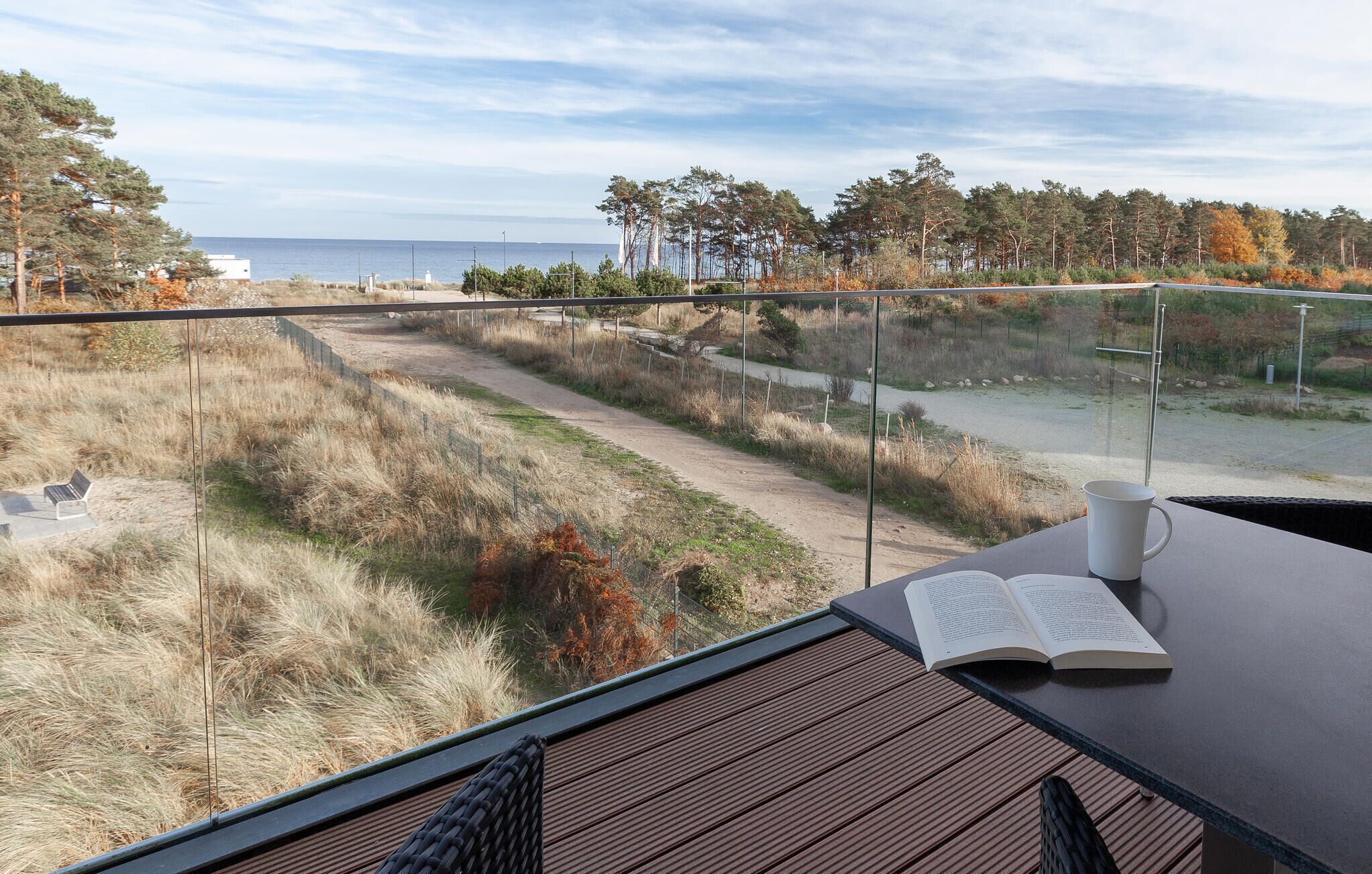 Vom großen Schlafzimmer mit eigenem Fernseher und natürlich auch vom Balkon aus können Sie einen herrlichen Blick über den Park und den Kiefernwald bis hin zur Ostsee genießen und die Seele baumeln lassen. Das Sofa im Wohnbereich lässt sich in zwei komfortable zusätzliche Schlafmöglichkeiten umfunktionieren (1,60 x 2,00m). Die top ausgestattete Küche lässt ebenfalls keine Wünsche offen und lädt zu Kochabenden im Kreise Ihrer Lieben ein. Kaffeeliebhaber freuen sich sicherlich über die bereitstehende Nespresso-Maschine (Kapseln bitte mitbringen).