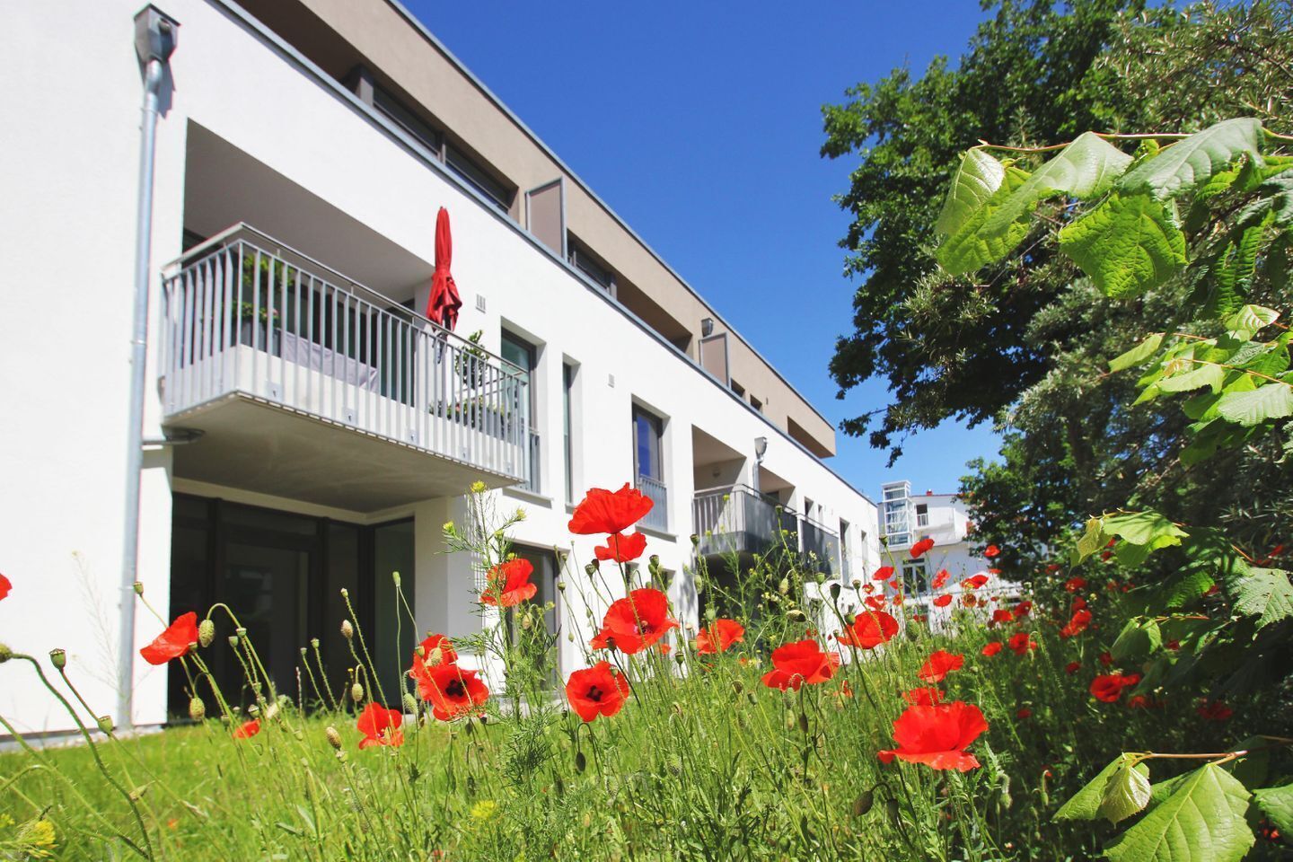 Vor den Ferienwohnungen in Prora Solitaire erstreckt sich eine parkähnliche Gartenlandschaft mit Außenpool, Aufenthaltsbereichen und einheimischer Flora und Fauna. Der Garten steht exklusiv den Gästen von Prora Solitaire zur Verfügung, ein kleiner Kiefernwald schirmt ihn vom Strand ab und sorgt für Privatsphäre. Prora Solitaire - eine Oase der Ruhe für Körper, Geist und Seele das ganze Jahr! Für Elektrofahrzeuge stehen Ihnen vier Ladestationen mit einer Ladeleistung von jeweils 22,5 kW zur Verfügung. Die kostenpflichtigen Ladestationen befinden sich im Parkhaus und sind ausschließlich für Hotelgäste zugänglich.
