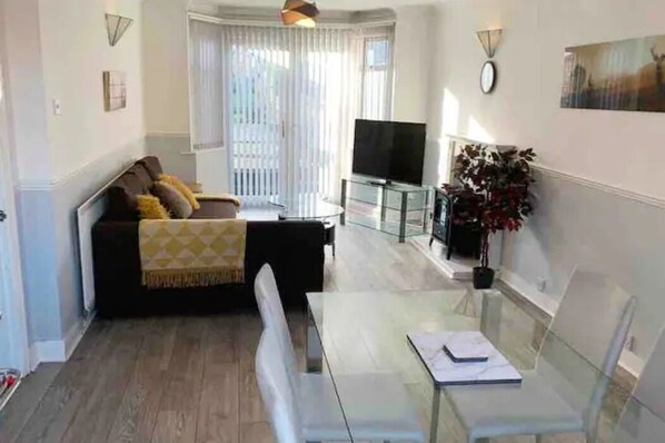 Spacious lounge and dining area with patio doors to the lovely green garden with patio area.