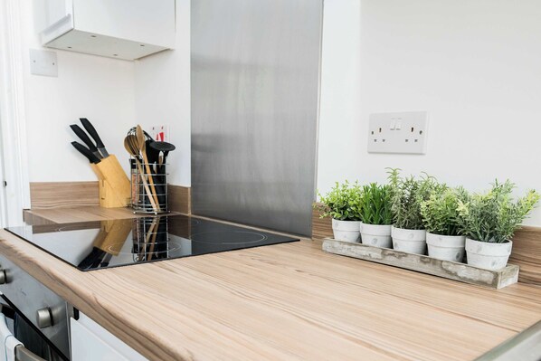 The fully equipped kitchen includes modern appliances such as an oven, hob, dishwasher, washing machine, fridge freezer, microwave, and kettle. With all necessary utensils, cookware, and tableware provided, preparing home-cooked meals is a breeze. A utility area adds further convenience.