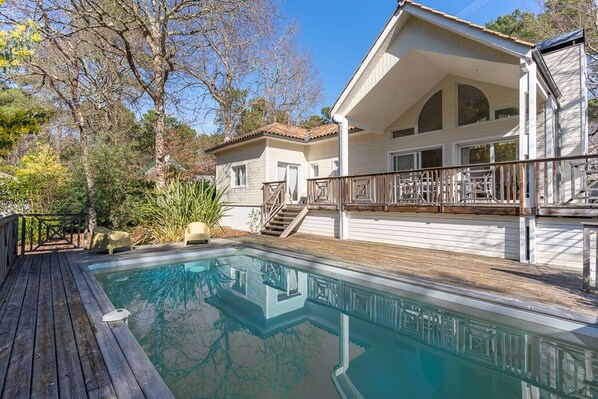 In the heart of the Golf de Biscarrosse, in a green setting, discover the charm of this beautiful friendly villa with heated pool (open from May to September and heated from June to September) salt that can accommodate 12 people (6 adults and 6 children).