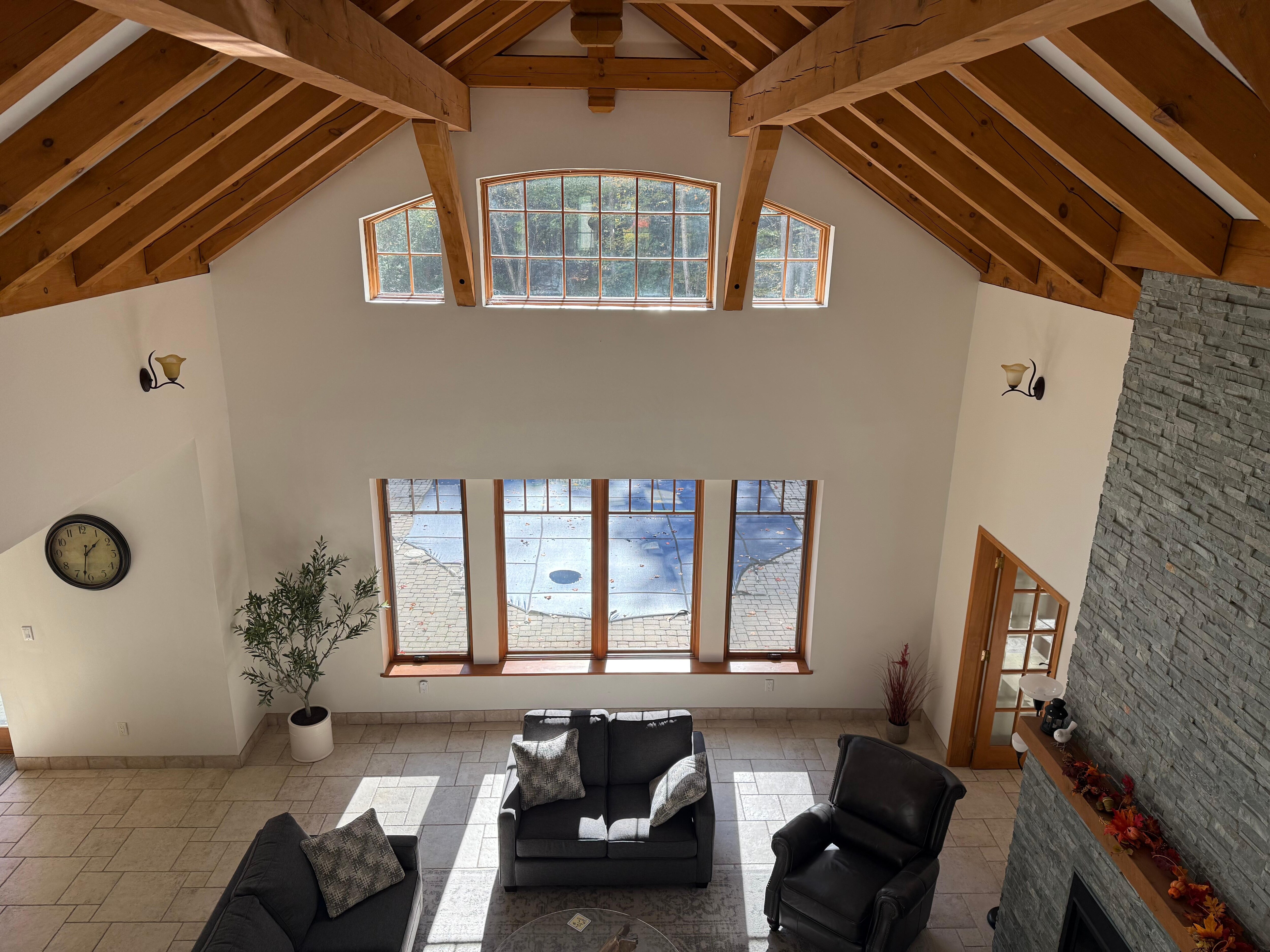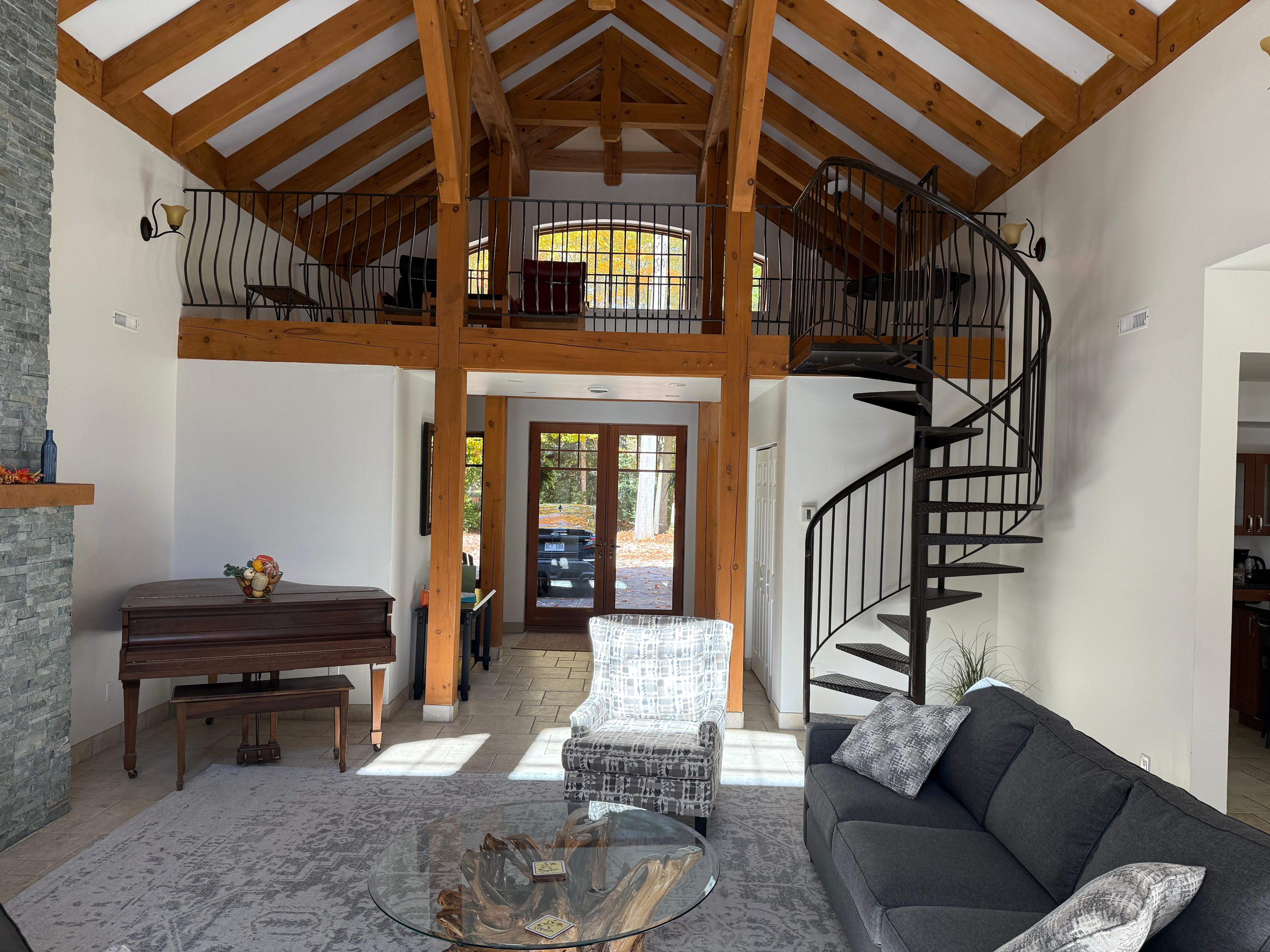 The StoneWood's open-concept design welcomes you with soaring ceilings and charming wooden beams. Gather around the cozy living area, complete with a crackling electric fireplace, plush seating, and even a baby grand piano for impromptu performances. A graceful spiral staircase invites you to explore the mezzanine, offering a bird's-eye view of the main living space.