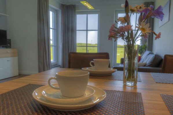 An alle Zimmer jeder einzelnen Ferienwohnung wurden höchste Standards bei Einrichtung und Ausstattung angelegt. HD-Fernseher, Sofalandschaft, Fußbodenheizung und vollständig ausgestattete Küche mit Herd mit Ofen, Geschirrspüler sowie Mikrowellen sind bei uns selbstverständlich.
