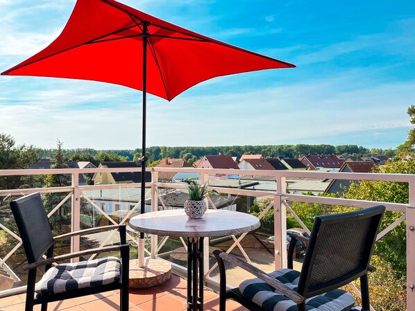 Das Wohnzimmer ist hell und modern eingerichtet. Auf der gemütlichen Couch könnt ihr abends herrlich zusammensitzen und den schönen Strandtag Revue passieren lassen. Es stehen dir ein Flachbild-TV und ein DVD-Player zur Verfügung. Zusätzlich lassen zahlreiche Bücher keine Langeweile aufkommen. Die Couch kann durch Ausklappen in einen Komfortschlafplatz für zwei Personen verwandelt werden. Der moderne Esstisch am hellen Balkonfenster bietet den idealen Platz für gemeinsame Mahlzeiten.
