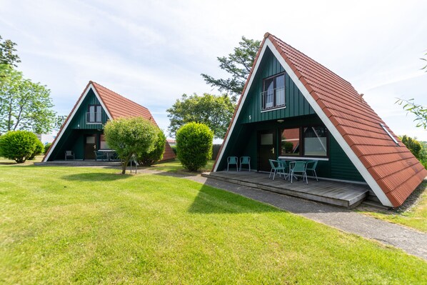 Auf zwei Ebenen stehen dir in den Finnhütten auf ca. 45 m² ein Wohn- und Essbereich mit integrierter Wohnküche, ein Duschbad sowie zwei separate, hintereinanderliegende Schlafzimmer zur Verfügung. Entspannen kannst du dich auf den möblierten Terrassen der Häuser. Auch die schöne Grünanlage lädt zum Verweilen oder Spielen mit den Kindern ein.