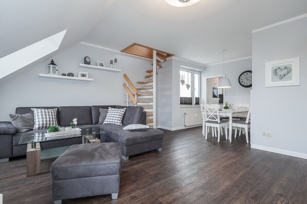 Der möblierte Balkon ist aus dem Wohnbereich zu erreichen. Dieser schließt sich dem lichtdurchfluteten Wohnzimmer direkt an. Lass dich auf der bequemen Wohnlandschaft gerne von dem modernen Flachbild-TV oder der Stereoanlage mit CD/USB sowie ein DVD- und Blu-Ray-Player unterhalten. Der gemütliche Essplatz für 6 Personen lädt zu gemeinsamen Mahlzeiten oder Spieleabenden im Kreise der Familie ein.