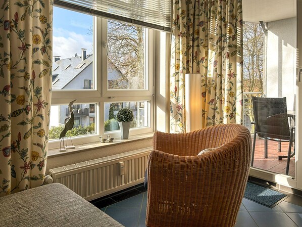 Dein gemütlicher, gefliester Wohnbereich mit großzügiger Sitzecke ist ausgestattet mit einer Schlafcouch (130 x 210 cm) und einem TV-Flatscreen.