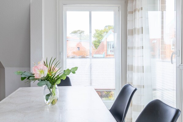 Ein gemütliches Esszimmer bietet neben dem großen Esstisch auch eine wunderbare Aussicht auf die Cafés und Restaurants im Zentrum sowie eine gemütliche Sitzecke mit SAT-TV (43 Zoll Smart TV LCD).