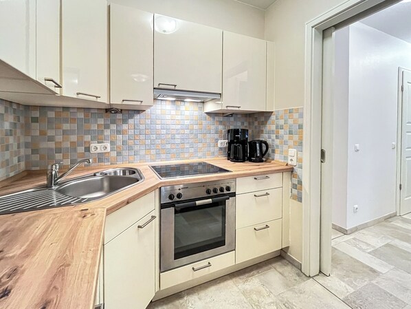Die hochwertig und modern eingerichtete Küche dieser Ferienwohnung verfügt über einen Geschirrspüler, einen Herd mit Backofen und ein 4-Platten-Cerankochfeld, einen Kühlschrank mit Gefrierfach, eine Mikrowelle und vieles mehr. Das Duschbad ist modern ausgestattet. Ein Gäste-WC ist vorhanden. Auf der Terrasse kannst du den vorhandenen Elektrogrill (Tischgrill) ausgiebig nutzen.