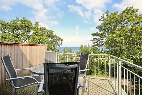 Das Wohnzimmer hat neben dem Essbereich, von dem aus du auch auf die Ostsee sehen kannst, eine voll ausgestattete Küchenzeile. Es stehen dir ein hochwertiges Cerankochfeld, ein Backofen, ein Kühlschrank mit Gefrierschrank, ein Geschirrspüler, eine Mikrowelle und vieles mehr zur Verfügung.