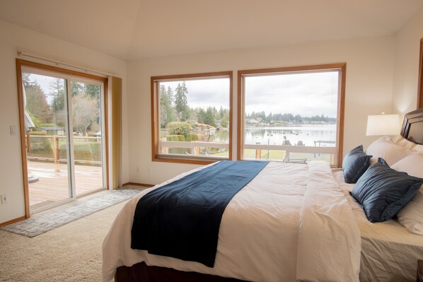 Connected to the foyer and dining/kitchen is the living room (2 comfy pullout couches, coffee table, 75-inch TV, and fireplace) with beautiful views of Lake Tapps. The foyer, living room, dining space, and kitchen form a spacious, connected hall providing unobstructed views of Lake Tapps from every corner. The living space opens to a large wooden deck with a sun umbrella, BBQ, and patio furniture. The deck provides access to the lawn and beautiful Lake Tapps.