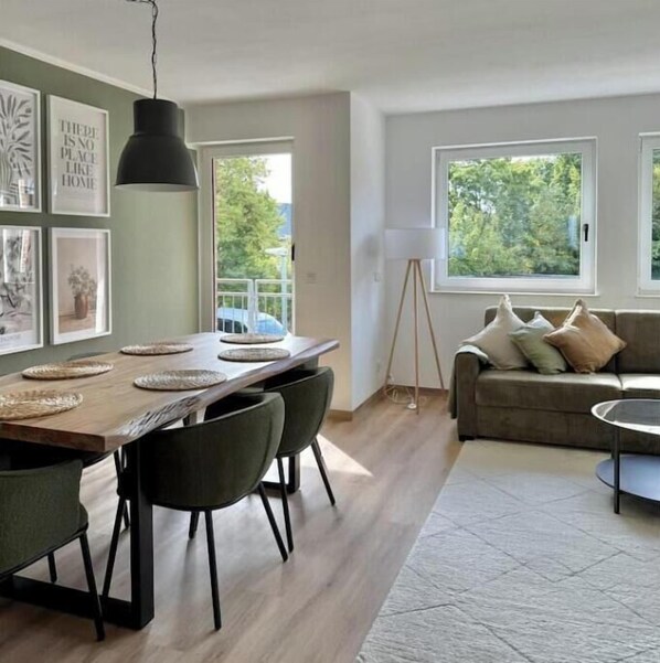 Die großzügige Wohnung verfügt über zwei komfortable Schlafzimmer mit gemütlichen Doppelbetten sowie eine zusätzliche Schlafcouch im einladenden Wohnzimmer – ideal für bis zu 6 Gäste. Der helle Wohnbereich lädt zum Entspannen ein, ob bei einem Filmabend oder mit kostenfreiem WLAN.