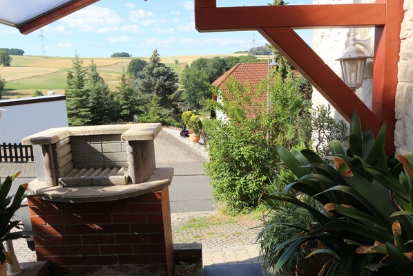 Für unsere Gäste haben wir eine kleine überdachte Sitzecke mit einem Grill gleich am Haus eingerichtet.