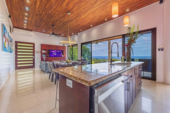 Die zweistöckige Villa bietet sowohl von den Hauptschlafzimmer-Suiten mit eigenem Balkon als auch von den anderen Schlafzimmern und dem Rest der Villa einen unverbauten 180-Grad-Blick auf die Pazifikküste. Neu - soeben hinzugefügt, hat das 3. Schlafzimmer nun Zugang zum Badezimmer auf der unteren Ebene, was den Komfort und die Privatsphäre der Gäste erhöht.