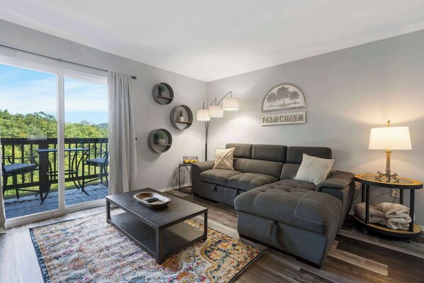 The comfortable sofa with chaise lounge in the living room is practically begging you to lie down for an afternoon nap or spend your downtime streaming your favorite shows on the smart TV. The gorgeous hardwood floors flow throughout the open floor plan, blending each space seamlessly together and keeping the conversation flowing. The chic dining room table with bench style seating can seat 6, with an additional 2 stools at the coffee bar. The bright and open kitchen is fully modernized with stainless steel appliances and a full suite of cookware and dining ware for whatever culinary aspirations you set your mind to. Drip and Keurig coffee makers are ready for your morning wake-up call, enjoyed out on the shaded patio with café table for 2 and sweeping views of the surrounding area.