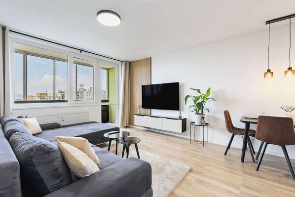 Alle Gästezimmer im Cloud Apartment - City & Nature Escape umfassen Komforts wie Esstische und WLAN.