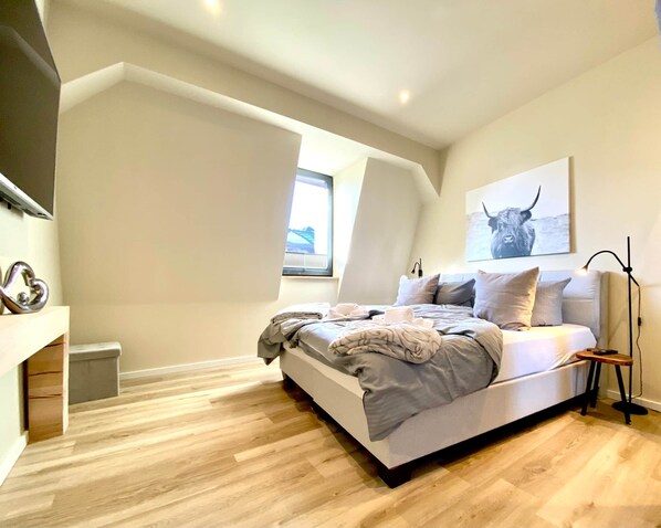 Drei Doppelzimmer mit Boxspringbetten, weichen Decken, Daunenkissen und große Smart-TVs laden zum Wohlfühlen ein. Die Fußbodenheizung vermittelt dabei eine angenehme Wärme. Die exklusive Küche ist voll ausgestattet und lässt keine Wünsche offen. Sie können sogar zwischen Tee, Filterkaffee oder DocleGusto entscheiden.
