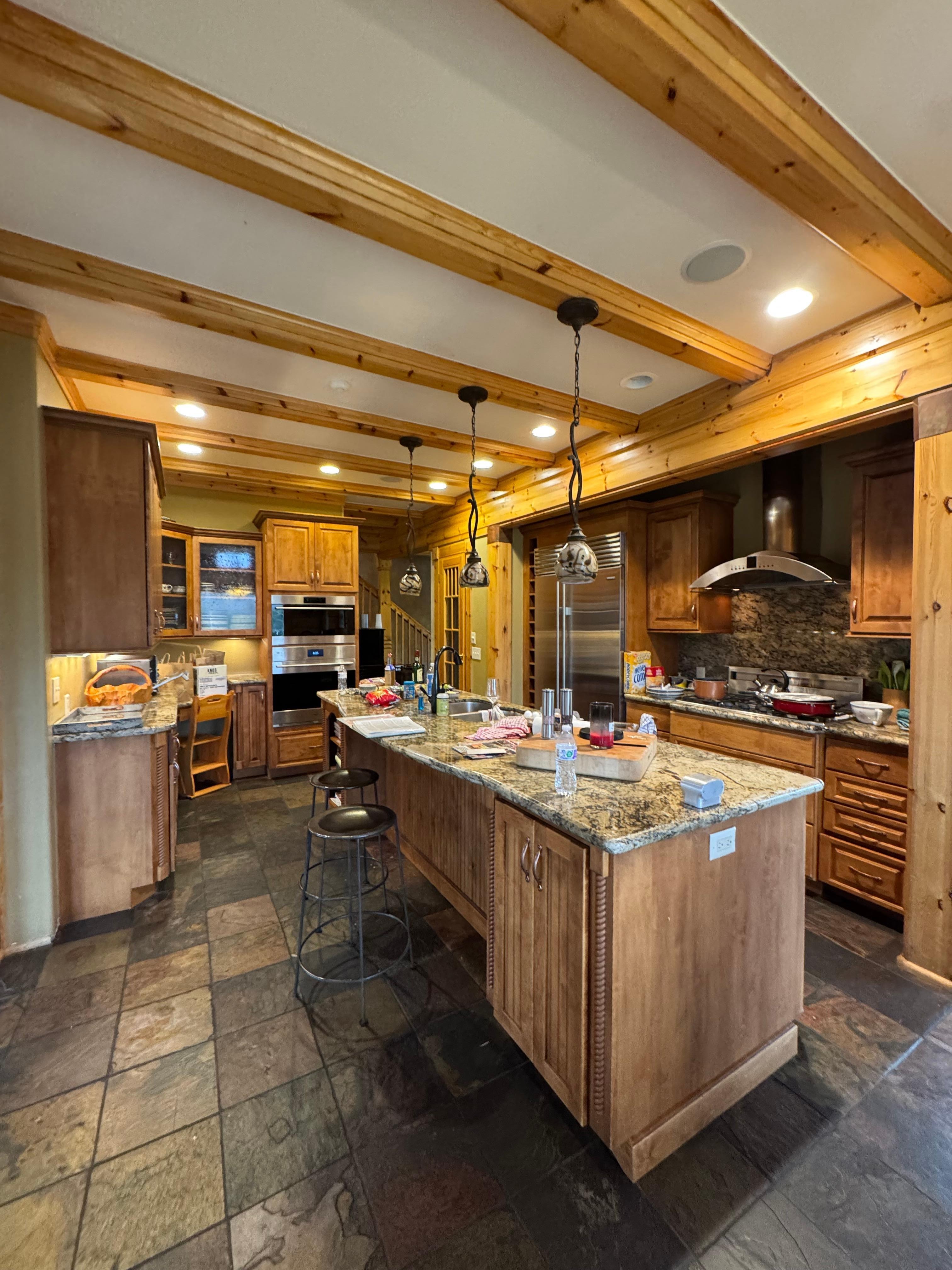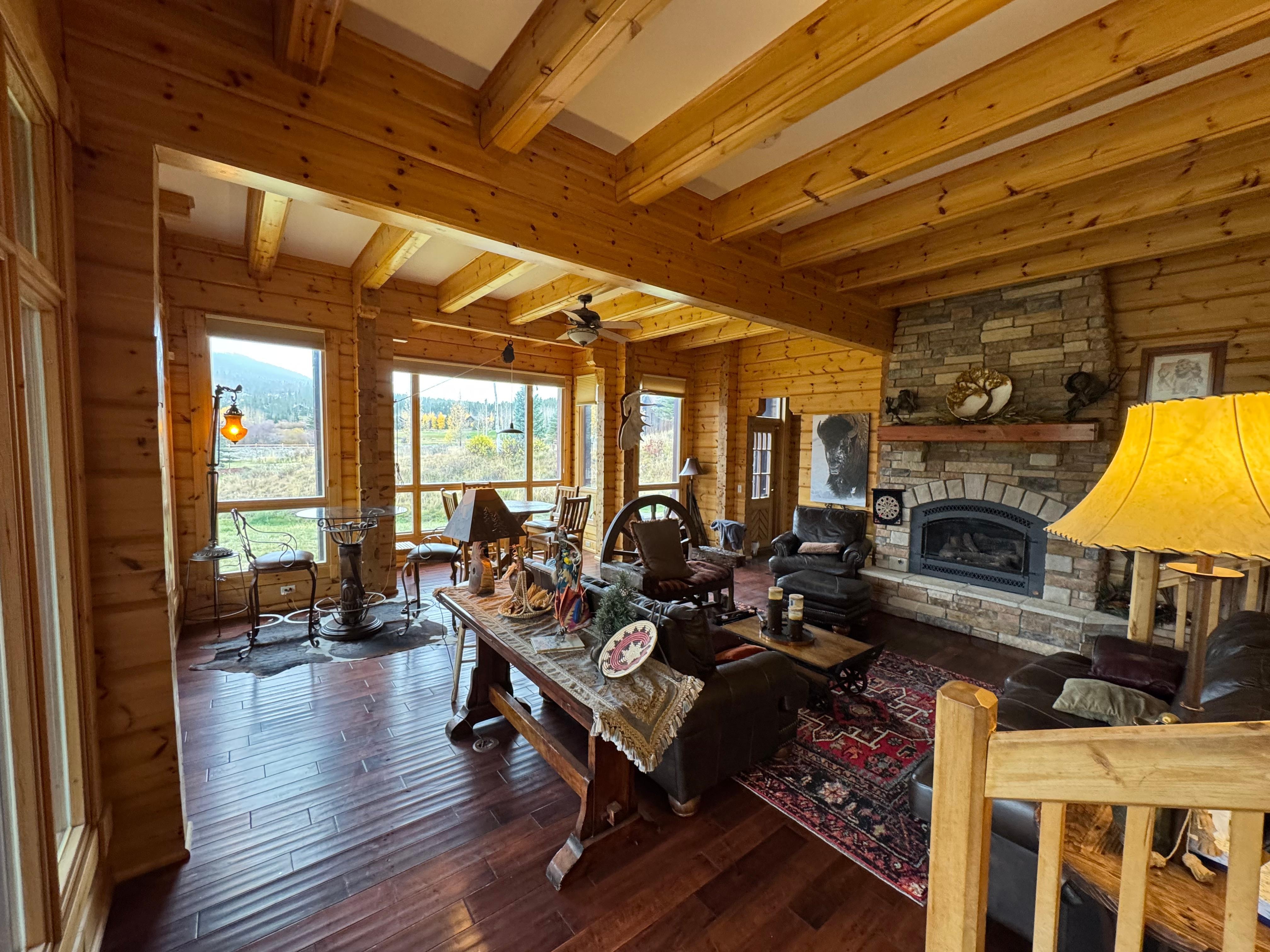 Inside, this elegant mountain home is as inviting as it is spacious. The kitchen greets you with rich wood cabinetry, polished stone countertops, and modern stainless steel appliances—ideal for everything from quick breakfasts to hearty après-ski meals. A cozy kitchen table for six encourages laid-back mornings, while the formal dining room offers another six-seat table for evenings filled with great food and conversation. In the bright and welcoming living room, large windows showcase mountain views while a crackling fireplace, plush couch, loveseat, and bench invite you to unwind. Play board games at the nearby four-person table or sip cocktails at the high-top for two, perfectly placed beside the panoramic windows.