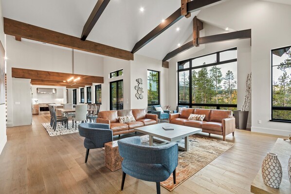 The airy living room features vaulted ceilings, seating for 12 and plenty of room to pull up additional seats while you cozy up to the fire. If you’re gathered to watch the “big game”, you’ll feel like you’re part of the action while watching on the 75” TV.