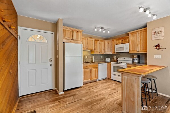 The fully equipped kitchen offers everything you need to prepare meals, including a drip coffee maker, slow cooker, and waffle maker. Whether you're making a cozy breakfast or a hearty dinner, this kitchen is ready to support your culinary needs.