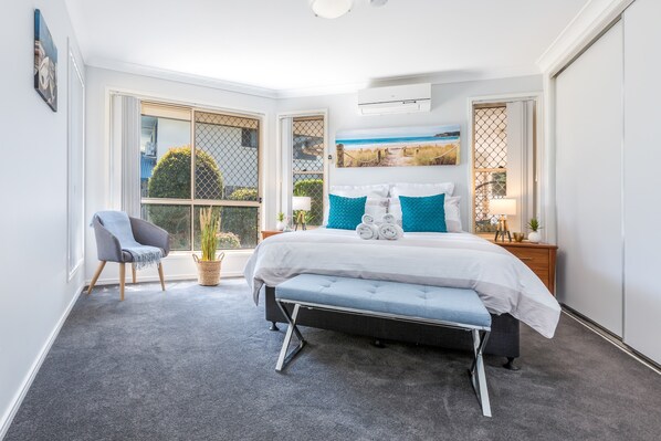 Volle Sicherheitsgitter, Klimaanlage in beiden Wohnbereichen und im Hauptschlafzimmer, Deckenventilatoren in anderen Räumen.